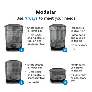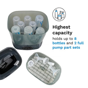 Automatically sterilizes and dries 33% faster - Compatible with any brand of bottles, pump parts, pacifiers and accessories