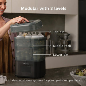 • Versatile & Modular: Features 3 levels to meet your needs (1 bin and two racks that fit in bin); Includes two accessory trees for pump parts/pacifiers; Sleek, modern and compact design looks great on your kitchen countertop