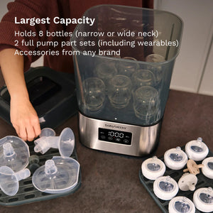 • Largest Universal Capacity: Holds 8 bottles (narrow or wide neck), 2 full pump part sets (including wearables) & accessories from any brand - all in one cycle! Compatible with plastic, glass, and silicone products