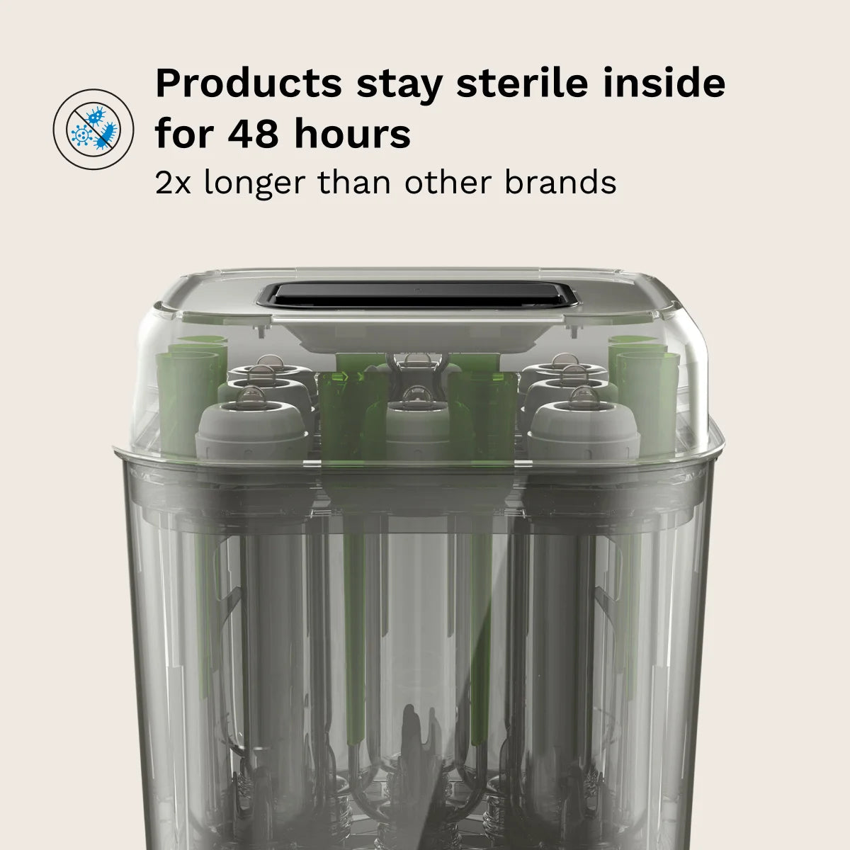 • Automatically Sterilizes & Dries Bottles, Pump Parts & Accessories in 1 Easy Step: Kills 99.9% of germs with steam, then dries with hot air; Products stay sterilized inside for 48 hours; Features Countdown Timer, Auto-Shut-Off & Quick Setup